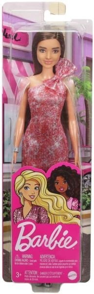 Barbie’s brunette hairstyle complements the dramatic flair of her red dress. Her hair is styled in soft, cascading waves that frame her face and add a touch of classic beauty to her look. The brunette color contrasts beautifully with the vibrant red of the gown, creating a striking and elegant appearance. The hairstyle is designed to be both fashionable and timeless, enhancing Barbie’s overall look and adding to her glamorous appeal.