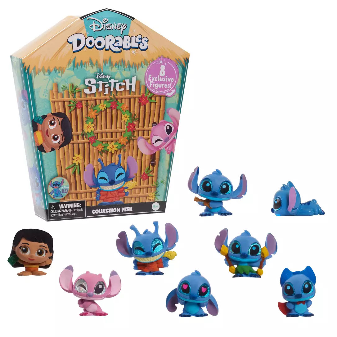 Behind every door a surprise is in store with the Disney Doorables Stitch Collection Peek Set. Discover a tropical-themed, 20th Anniversary collection of 8 exclusive figures from the stories of Disney’s Lilo & Stitch! This Peek set gives fans the ultimate unboxing experience with a fresh packaging design featuring peel-and-reveal secrets in addition to characters including Lilo, Angel, and Stitch. Ideal for collecting and trading, fans of Disney toys can recreate classic scenes – or invent their own with Disney Doorables collectible kids toy figures and playsets.